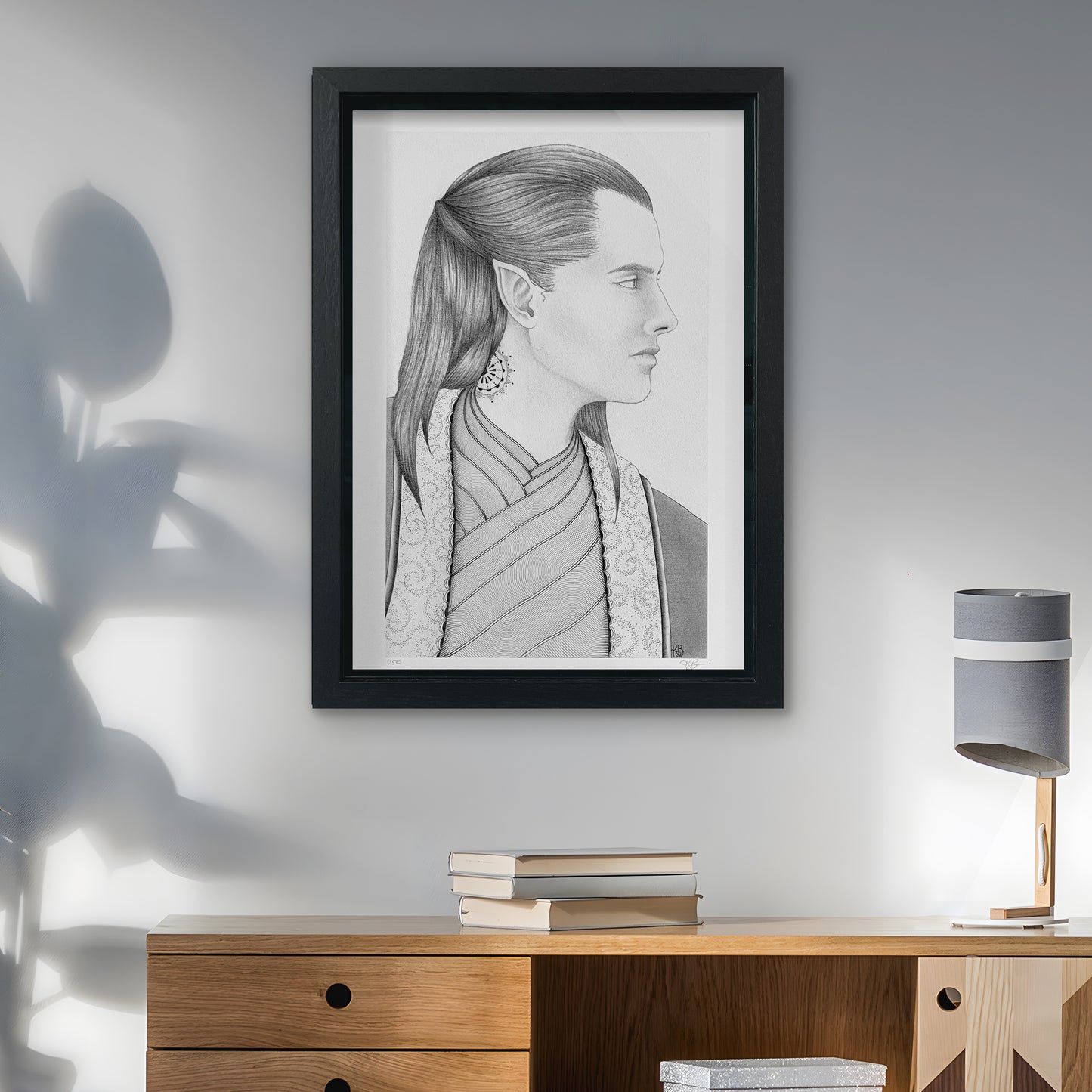 In this drawing, I have imagined an elf prince, decked out in his finery, looking imperiously beautiful. I have given him an intricate tattoo, which might be a symbol of his royalty, a sign of his warrior skills, or a sigil of his magical abilities.
