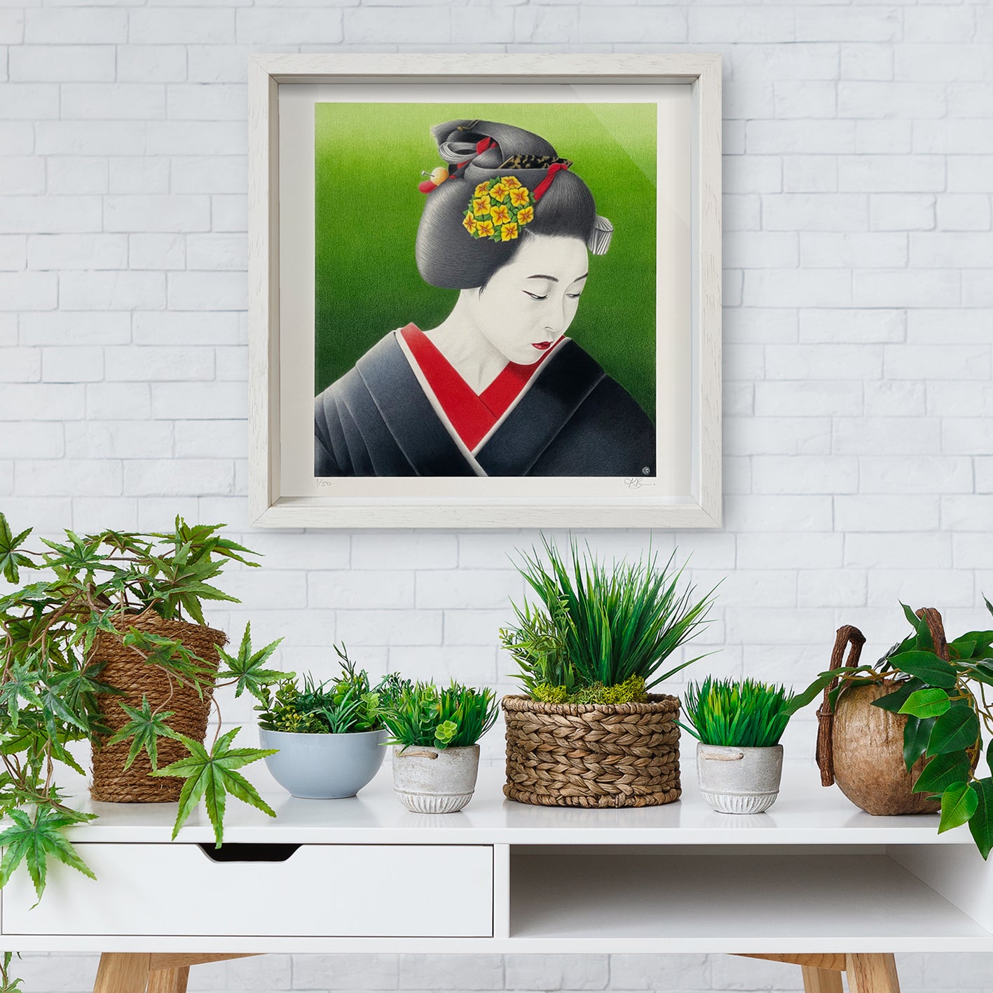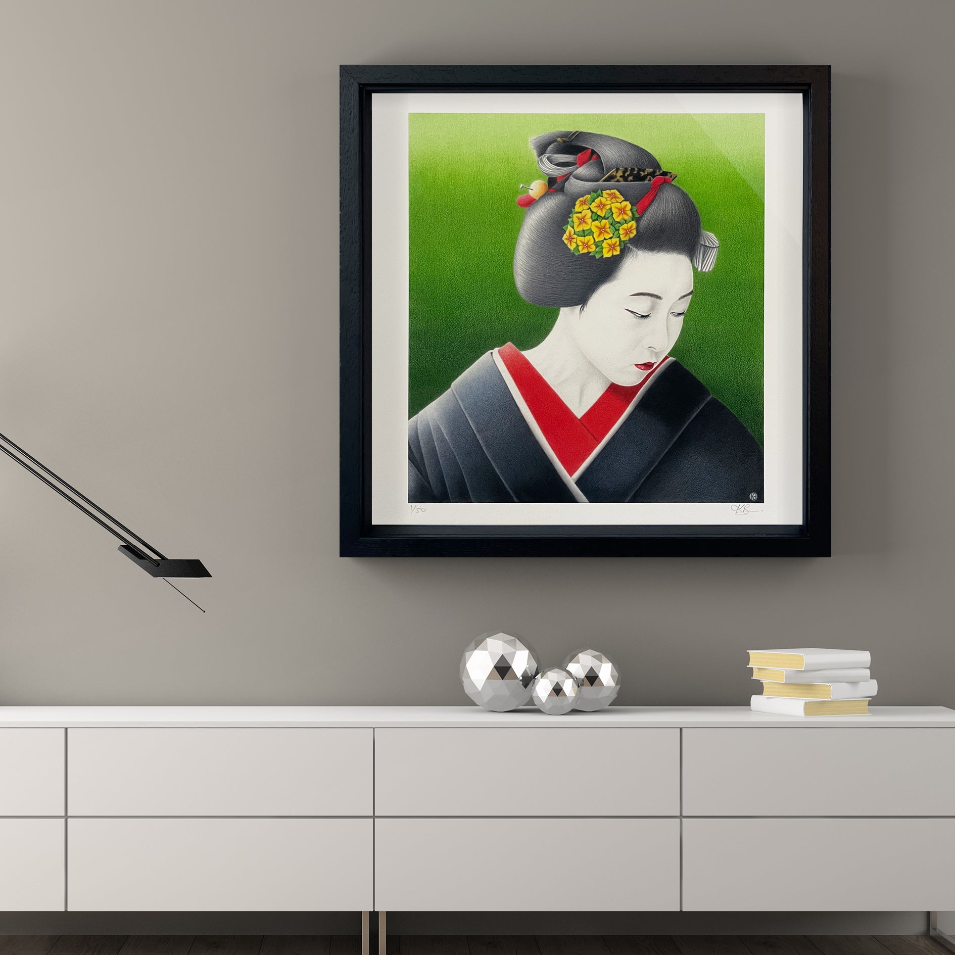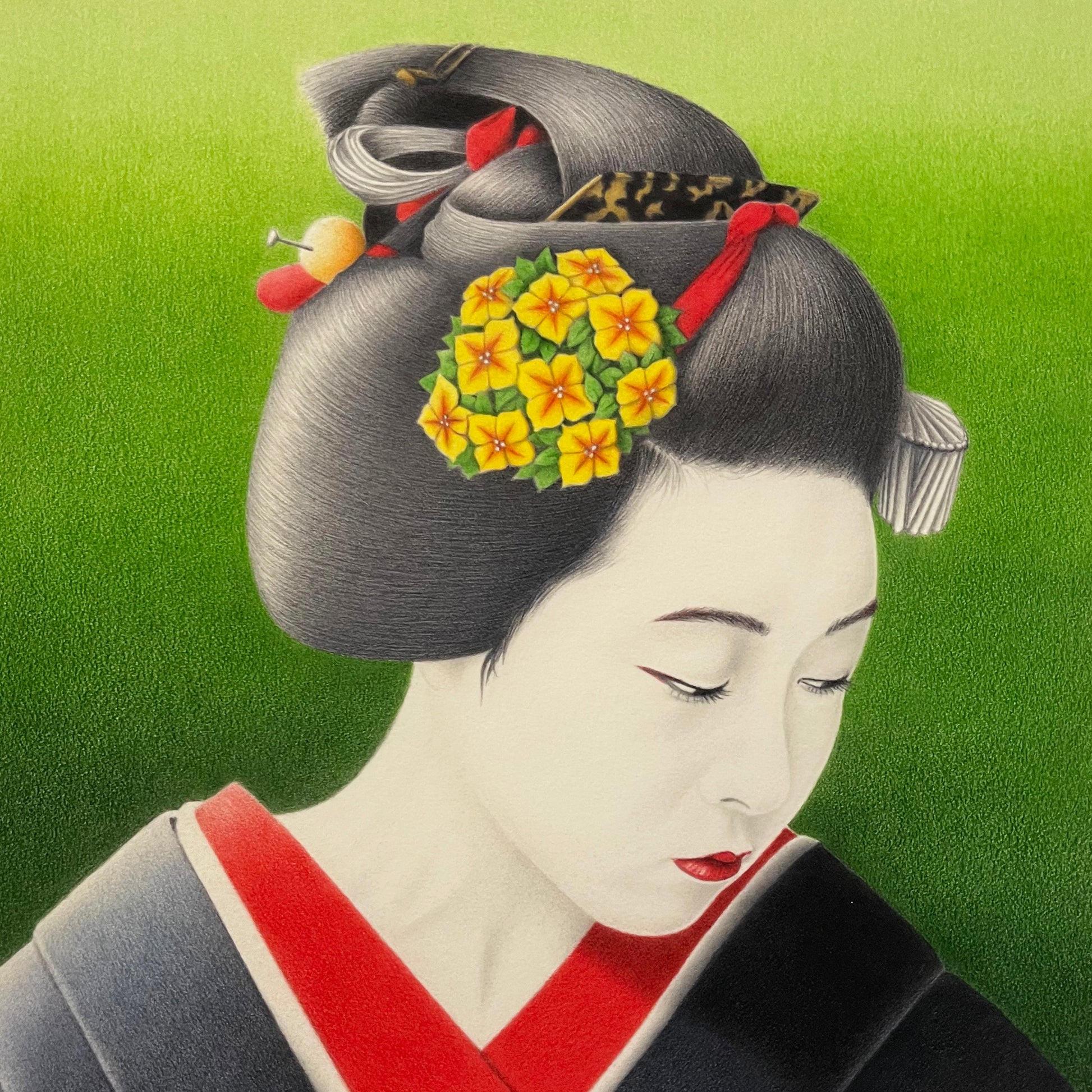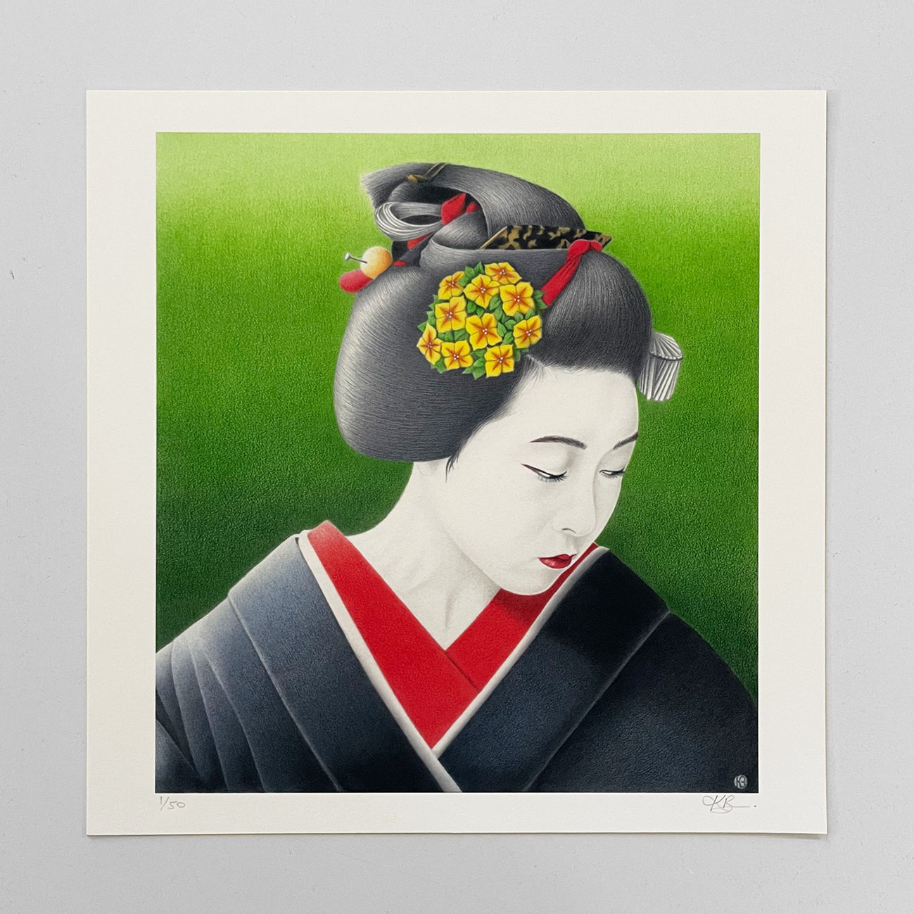 Maiko is the term used for a trainee Geisha, a traditional Japanese artist and entertainer. With a fascinating heritage spanning several centuries, every aspect of a Geisha and Maiko’s professional appearance and behaviour has meaning. In this drawing I have tried to capture the lyrical grace and skilful precision of a Maiko in formal attire.